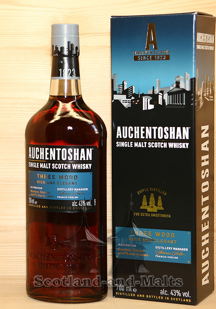 Auchentoshan Three Wood - Bourbon + Oloroso + PX Sherry Casks mit 43,0% single Malt scotch Whisky