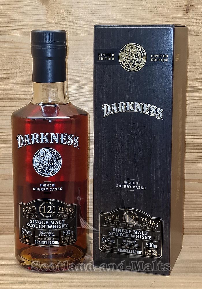 Dieser Single Malt aus Craigellachie reifte ein Dutzend Jahre lang, einschließlich eines Finishs in einem Oloroso-Sherry-Fass. Nicht irgendein Fass, sondern ein speziell angefertigtes Oktavfass von den Leuten von Darkness! Die kleinere Fassgröße sorgt für eine stärkere Interaktion zwischen dem Whisky und dem Holz, was hier viel Oloroso-Sherry-Einfluss bedeutet.