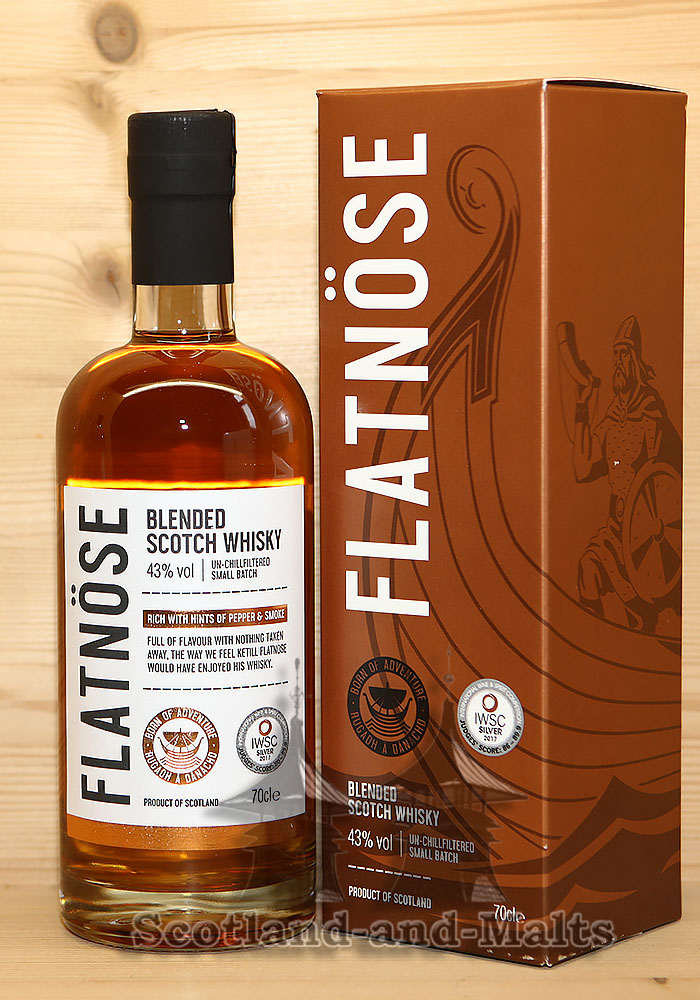 Flatnöse Blended Scotch Whisky is a rich, full-flavoured blend, with hints of pepper and smoke, bottled at a higher strength of 43% vol. Like the very best Scotch whiskies, it is unchill-filtered for much greater mouthfeel and persistance. Of course, there is Islay single malt whisky in the blend,
