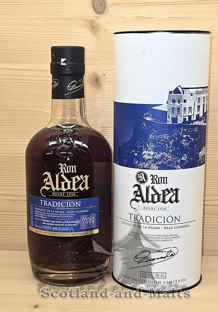 Der Ron Aldea Tradicion ist ein Rum aus Spanien von den Kanarischen Inseln, welcher aus kanarischen Zuckerrohrsaft hergestellt wird. Der Stil entspricht in etwa dem Stil eines Rum Agricole. Der Aldea Tradicion ist eine limitierte Abfüllung aus dem Jahr 1999/2023. Die Lagerung erfolgte für 24 Jahre in ehemaligen Rotweinfässern aus französischer Eiche. Diese bringen Aromen von Trockenfrüchte und Schokolade. Im Geschmack zeigen sich würzig-süße Eichennoten, Schokolade und Leder.